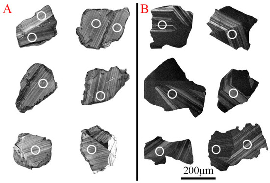 Figure 8. Representative cathodoluminescence images of cassiterite from the Maoping W–Sn deposit. The spot size of the laser beam is 50 μm (white circles). (A) Sample Mp-5-11 from quartz vein ore. (B) Sample Mp-75-17 from greisen ore.