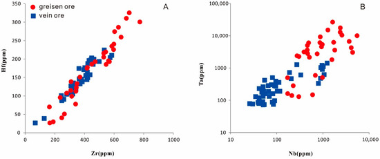 Cassiterite grains from the quartz vein and greisen samples were analyzed for trace elements (Table S1). Overall, the concentrations of trace elements in cassiterite from the Maoping W–Sn deposit are relatively high. Most cassiterite grains are characterized by high concentrations of Nb (25.86–5483 ppm), Ta (72.60–26695 ppm), Zr (67.59–773 ppm) and Hf (26.67–325 ppm). The concentrations of Fe, W, and Ti also vary significantly in all cassiterite grains, with Fe ranging from 145 to 5593 ppm, W ranging from <1 to ~5000 ppm, and Ti ranging from 117 to 3528 ppm. Sc is present at concentrations from 7.9 to 1134 ppm in the cassiterite. The Co and Ni concentrations usually held steady within a single sample. The U concentrations were found to be mostly below 30 ppm. The concentrations of other trace elements are very low (e.g., ≤2 ppm Ba, ≤2 ppm Mo, ≤3 ppm Sb). There are clear positive correlations between Nb and Ta and Zr and Hf, as shown in Figure 10.