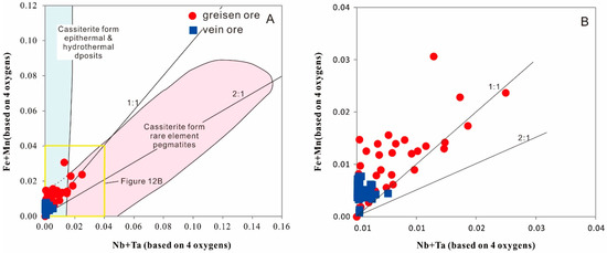 Figure 12. Covariation plot of Nb + Ta with Fe + Mn in cassiterite grains from the Maoping W–Sn deposit (modified from [76]). (B) is the yellow box area of (A).