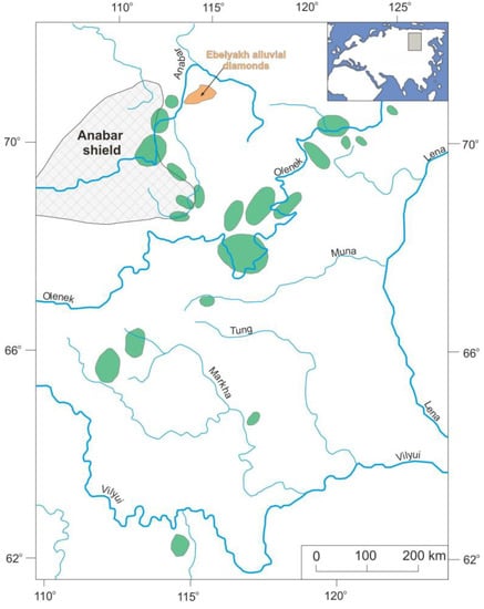 Location of Ebelyakh alluvial diamond deposits in the northeastern Siberian craton. The kimberlite fields are shown as green.