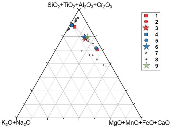 The compositional features of combined Glass + Cpx inclusions and reconstructed melts in diamonds Hi-51 (1—glass; 2—Cpx; 3—reconstructed melt) and Hi-39 (4—glass; 5—Cpx; 6—reconstructed melt). Melt inclusions in diamonds from Yakutian kimberlites (7—data from [,], 8—data from []) and 9—composition of low-Si adakites [] are shown for comparison.