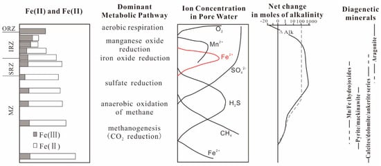 There are various microbial functional groups occupying different ecological niches, which have typical vertical zoning characteristics in the muddy sediment diagenesis zone (Figure 1) and distribute into an oxygen respiration zone (ORZ), an iron reduction zone (IRZ), a sulfate reduction zone (SRZ), and a methanogenesis zone (MZ) from top to bottom [,,]. Additionally, there are certain transition intervals between these zones []. Therefore, Fe2+ obtained from reduction of Fe3+ in IRZ will migrate up and down at the same time. Those migrating upward are oxidized by oxygen and nitrate generally to form a new ferric oxide and then precipitate. The downward migration is often reacts with the H2S produced by the SRZ below it and, lastly, forms iron sulfide such as FeS and then is buried [,,]. Moreover, the H2S produced in SRZ may also diffuse upward, directly reacting with the remaining iron oxides to form iron sulfide deposits, such as FeS [,].