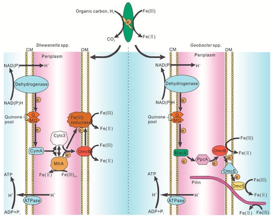 - Shi, L.; Rosso, K.M.; Zachara, J.M.; Fredrickson, J.K. Mtr extracellular electron-transfer pathways in Fe(III)-reducing or Fe(II)-oxidizing bacteria: A genomic perspective. Biochem. Soc. Trans. 2012, 40, 1261–1267. [Google Scholar] [CrossRef] [PubMed]