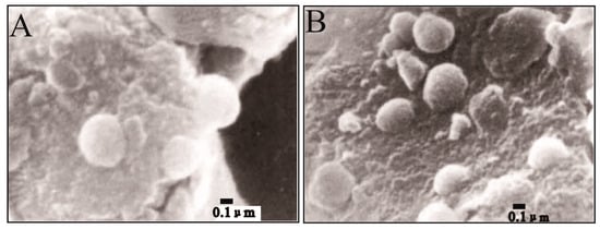 SEM images of dolomite with high iron content in microbial culture experiments []. Both (A) and (B) are illustrating nanocrystals of the ferroan dolomite mediated by subpherical nanobacteria on the surface of the substrate.