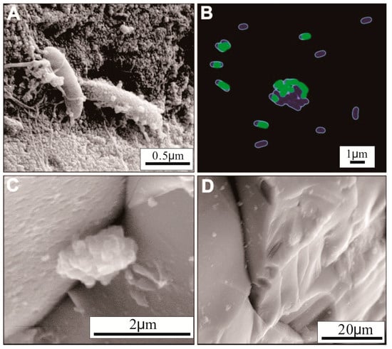 Micrographs of calcium-rich, disordered ferroan dolomite []. (A) Scanning electron microscopy (SEM) image; (B) Scanning laser confocal microscopy image; (C) Environmental SEM (ESEM) micrograph; (D) ESEM micrograph of the basalt surface in the sterile control.