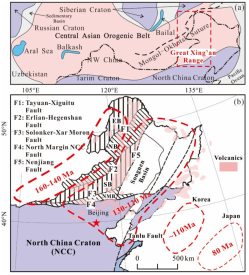 Geological sketch map of the Central Asian Orogenic Belt (CAOB) and Great Xing’an Range (GXR). (a) is after [21]. (b) is modified from [22]. Ages in red indicate the Pacific oceanward migration of Pacific subduction in Jurassic and Cretaceous [22]. The GXR is composed of blocks EB, NB, SB and NMB. EB, Erguna Block; NB, North Great Xing’an Range Block; SB, South Great Xing’an Range Block; NMB, North Margin Block of North China Craton.