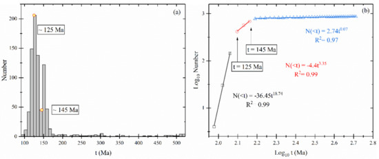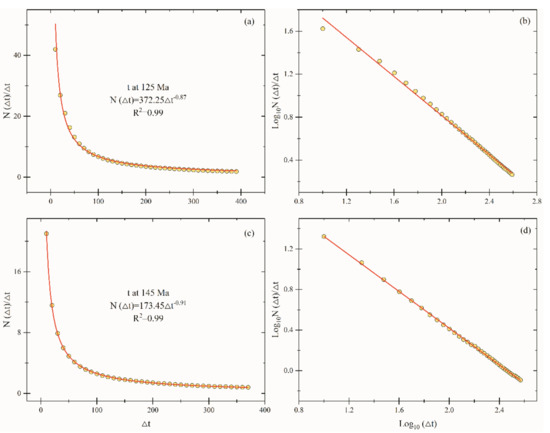 As the results show in Figure 2, 125 Ma is the age peak in the histogram, while 145 Ma is the transition in the cumulative number-age distribution diagram. The average fractal densities at about 125 and 145 Ma were fitted by the power-law functions (Figure 3). This suggests that ages at 125 and 145 Ma are subject to a fractal model and can be described by the singularity analysis method [18,23,33,34,35,36].