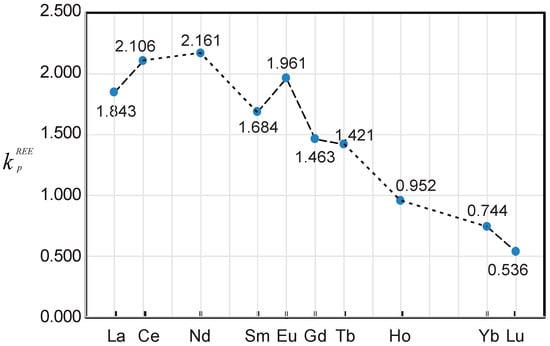 Plot of the predicted maximum values of REE partition coefficients () between magmatic fluids and granitic melts based on the equations in Table 2. Number marked on the graph is the maximum value of predicted for each element, e.g., La is equal to 1.843.