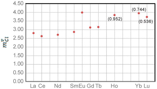 A virtual examination of Figure 1 suggests that the value of would approach its maximum with increasing ()3 to a certain value, or a threshold value. When ()3 is much smaller than this threshold value, has a linear relationship to the variable as described by [1,2,5]. As long as the value of a magmatic fluid reaches the threshold value, the value of would reach the maximum, and then appear to remain constant regardless of how much the concentration of Cl in the fluid is increased. This conclusion is also achieved by a numerical analysis (i.e., differentiation) of the equations listed in Table 2. This practice is able to predict the ()3 threshold value and maximum value for each individual element (Table 3). Obviously, the implication of such threshold values and/or parameters needs to be explored further, and tested by more experimental work, because the existing dataset used in this paper (Supplementary Table S1) is obviously limited. Despite the limitations of the data, the functions presented in Table 2 appear to be applicable over the entire pressure range within the continental crust (e.g., 0.1 to 10.0 kb) owing to the maximum values relying only upon the Cl molality threshold values ()3 of the magmatic fluids (Figure 2; Table 3) irrespective of the pressure on the fluid–melt systems in question. Hence, it is recommended that the maximum value of for each REE be used to estimate the REE contents of the magmatic fluid once the Cl molality of the fluid reaches the threshold value.