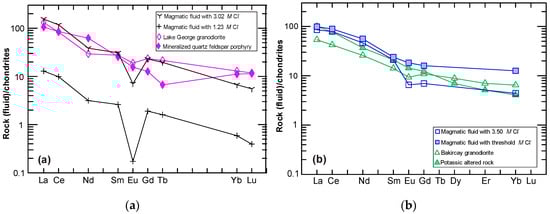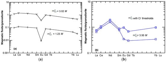 The Lake George granodiorite-normalized REE distribution patterns for magmatic fluids (see Table 4 for the estimated value of for each element) at a Cl molality () of 1.23 M and 3.02 M are plotted in Figure 4a, indicating that the REE concentrations in the magmatic fluids are remarkably elevated as the value of increases (Table 4). Also, the REE pattern of the fluid displays a pronounced negative Eu anomaly at equal to 1.23 M, whereas the Eu anomaly becomes less pronounced when equals 3.02 M. Figure 4b shows REE patterns in the calculated magmatic fluids at = 3.50 M and with the threshold values (Table 3) normalized by the Bakircay granodiorite. Although their LREEs are similar, the fluid with the threshold Cl− molality displays relatively elevated HREEs compared to the granodiorite.