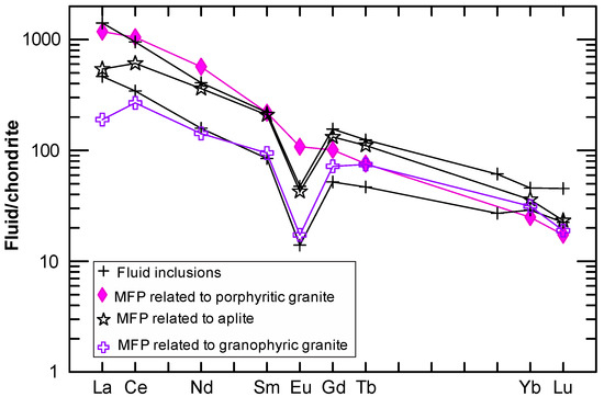 A comparison of chondrite-normalized REE patterns of the fluid inclusions (analyzed by inductively coupled plasma mass spectrometry, or ICP-MS) [6] with calculated magmatic fluid phases (MFP) related to the porphyritic granite (sample A29), the aplite (A17), and the granophyric granite (A12) from the Capitan Pluton, New Mexico, U.S.A. [39] (Supplementary Table S2). The chondrite normalizing values are taken from [38].