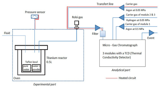 The apparatus developed for the experiments consisted of a 500 mL titanium (C276) autoclave coupled to a gas analysis system (Figure 2). Experimental conditions can simulate a confining pressure and temperature ranging respectively from 0 to 300 bar and from 0 to 250 °C. A Rolsi® valve connected to the autoclave (Rapid On-Line Sampler Injector) thanks to a C276 capillary tube (Ø 1.6 × 0.1 mm) allowed regular micro-sampling of the gas phase from 0.01 mg to 1 mg [22]. This volume represents less than 0.03% of the initial quantity of the gas in the reactor and did not disturb the reaction environment. The complete test bench integrating the reactor, injection valves, and tubing were incorporated in an oven to avoid any cold spots. The Rolsi valve was composed of internal resistance for the same reasons. The gas phase was transferred to a micro gas chromatograph SRA R-3000 (µ-GC) for the regular in situ measurement of the chemical composition via a heated transfer line. The inert carrier gas used was argon at 0.05 MPa. The pressure/temperature (autoclave, Rolsi valve and transfer line) data of the system were controlled and continuously recorded thanks to a data acquisition and control system. The gas phase was analyzed with three columns: the first one was dedicated to light gas such as hydrogen, nitrogen and oxygen, the two others to carbon dioxide and gaseous hydrocarbons. Quantitative analyses were obtained thanks to the injection of 2 bar of N2 as an internal standard. Ratios of nitrogen peak and analyzed gas peak were done to calculate the amount of oxygen or carbon dioxide into the reactor. Calibration of µ-GC was performed by injection of 2 bar of N2 (internal standard) and then injection of O2 step by step into the reactor (0.60, 0.99, 1.4, 1.99 and 2.42 bar). For each O2 pressure, 10 measurements were made. Ratios of nitrogen and oxygen peaks were calculated for each measurement, and the average was reported vs O2 partial pressure to obtain the calibration curve (Figure 3). The error on those quantifications was calculated as a function of the dispersion of ratios (using the standard deviation). Here the standard deviation was equal to 0.01, meaning an error of 3.5%.