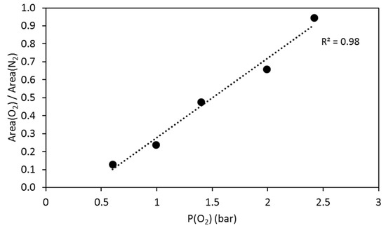 Calibration curve for quantitative analyses of oxygen into an experimental reactor. Ratios between O2 peak area and N2 peak area are plotted vs. O2 pressure.