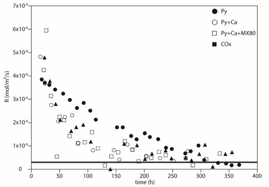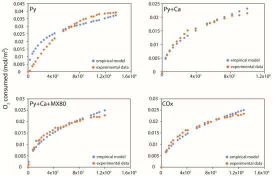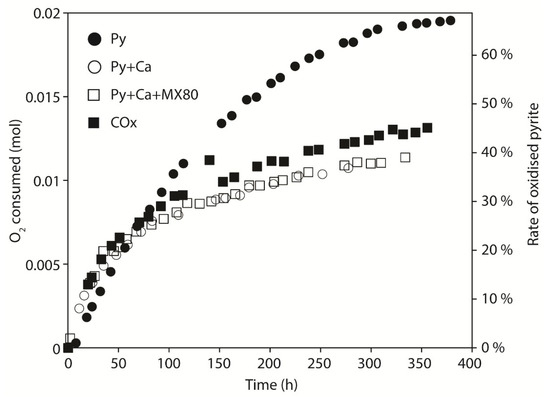 Curves of O2 consumption for Py + Ca and Py + Ca + MX80 experiments show very similar trends (Figure 4), and exhibit a linear trend after 100 h with a weak slope characteristic of a slower O2 consumption and a constant rate of pyrite oxidation. Thirty-seven percent of pyrite was oxidized in both the Py + Ca and Py + Ca + MX80 experiments after 275 h. For the COx experiment, the amount of oxidized pyrite was 45% after 355 h (42% in ~275 h) considering 3 wt % of pyrite in COx but in that case, the surface area of pyrites was not known and was likely greater (1.2 m2/g [20]) than the mean value assigned for the other experiments (0.5 m2/g). Pyrite oxidation as a function of time in the COx experiment was comparable to that of pyrite in the Py + Ca and Py + Ca + MX80 experiments.