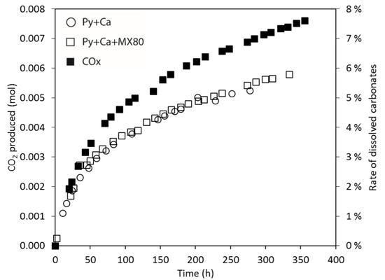 CO2 production during the three experiments involving calcite (Py + Ca, Py + Ca + MX80, COx) was also monitored (Figure 5). The total production of CO2 in the Py + Ca and the Py + Ca + MX80 experiments was around 5.8 ± 0.05 mmol and corresponded to the alteration of calcite by sulphuric acid (indicating 5.5 ± 0.3% of the initial calcite was dissolved). The production of CO2 was slightly higher in the COx experiment (7.6 mmol, 7.6% of calcite dissolved, considering 27 wt % of calcite in COx). In the experiments, the measured CO2 production was coherent with both the measured O2 consumption and the theoretical CO2 produced. The results also show that the CO2 production rate was similar in the three experiments until 25 h (~0.1 mmol/h). Then, it decreased faster in the Py + Ca and Py + Ca + MX80 experiments (~0.015 mmol/h) than in the COx experiment (~0.027 mmol/h).