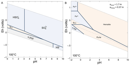 (A) Speciation of sulfur for an activity of 1.7 mol kg−1 at 100 °C. (B) Stability diagram of the Fe-S-O system at 100 °C with activities of aqueous sulfur of 1.7 mol kg−1 and aqueous iron of 0.37 mol kg−1. The considered aqueous and mineral phases were Fe2+, Fe3+, hematite, pyrite, S (α, β, γ), magnetite, melanterite.