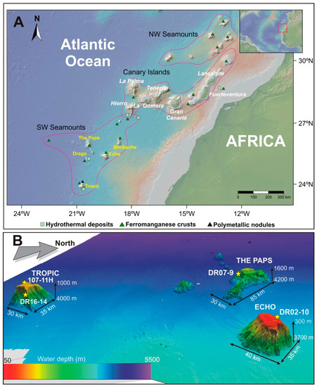 (A) regional setting of the Canary Islands Seamounts Province (CISP). General view of the study area where the Canary archipelago and the most important seamounts of the southwest area of CISP with their associated mineral deposits are displayed (Map from GeoERA-MINDeSEA project [50]); (B) 3D view of the studied seamounts and location of the sampling site.