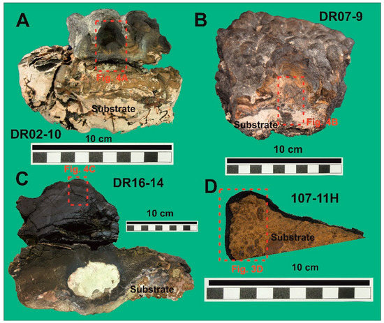 Image of selected Fe-Mn crust samples for this study. (A) Crust DR02-10 was dredged from Echo Sm., (B) crust DR07-9 from The Paps Sm., (C) DR16-14 and (D) 107-11H from Tropic Sm. Red discontinuous squares mark the areas where thin sections were taken for further investigations (Figure 4).