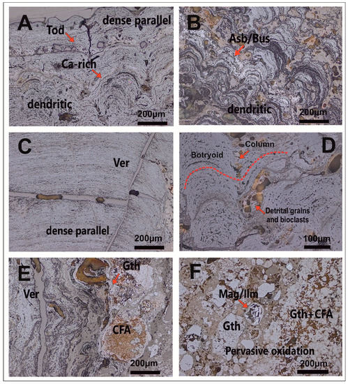 Microphotographs of the studied thin sections. (A) DR02-10, variation from dendritic to dense parallel textures and the presence of bright laminae of todorokite (Tod); (B) DR07-9, dendritic structure crowned by several bright laminae with fibrous minerals of asbolane (Asb) and buserite (Bus); (C,D) DR16-14, dense parallel and columnar textures essentially composed by vernadite (Ver); (E) 107-11H, contact between altered substrate (right) and Fe-Mn crust (left) with the presence of goethite (Gth) and carbonate-fluorapatite (CFA); (F) 107-11H, pervasive oxidation and phosphatization of the substrate rock with residual magnetite/ilmenite (Mag/Ilm) crystals.