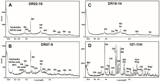 XRD profiles made on cross-sections show variations in mineralogy through the sequences of precipitation for each ferromanganese deposit, from sub-actual laminae on top (rich in detrital and 10Å Mn-oxides, i.e., DR07-9 or calcite, i.e., DR02-10 and DR16-14) to ancient layers at the base (richest in vernadite, i.e., DR16-14) as is detailed below.