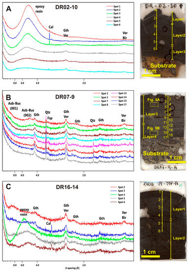 Finally, crust DR16-14 always shows peaks at 480, 550, 612 and 660 cm−1 belonging to vernadite, and birnessite that, in some laminae, are accompanied by small peaks at 300 350 and 400 cm−1, belonging to goethite (Figure 7E,F).