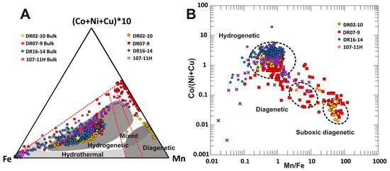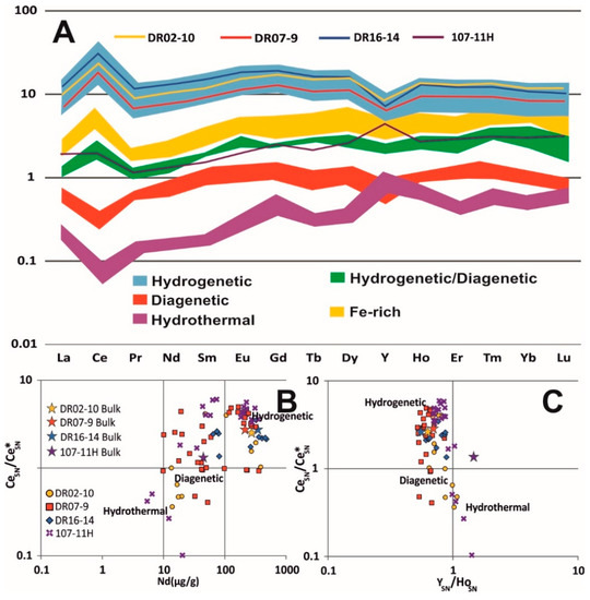 Finally, Fe-rich laminae found in samples DR07-9, DR16-14 and 107-11H have very high Fe (up to 40 wt. %), with low Mn (5 wt. %) and are also slightly enriched in REY (2600 μg/g). They are plotted in an intermediate field in the PAAS-normalized REY diagram (Figure 10A, yellow field).