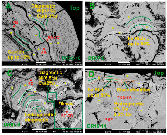 Crust DR16-14 shows mostly columnar to dense sub-parallel structural growth. In general, this crust shows in the EPMA analysis higher contents of Fe (23 wt. %), Mn (21 wt. %) and essentially Co (up to 1 wt. %); nevertheless, Ni, (3000 μg/g), Ba (2000 μg/g), Mo (570 μg/g), Ce (2600 μg/g) and V (1400 μg/g) contents are similar to the ones obtained on the low reflectivity laminae of crust DR07-9 (Figure 10D). In this crust, it is also possible to identify some local discontinuities, but they are less abundant, and they never are associated with the presence of high reflectivity fibrous laminae (Figure 10A,C). On top part of DR16-14, a slightly bright lamina have been found concordant with the growth structure enriched in Fe, Ti and V (up to 49 and 0.9 wt. % and 2500 μg/g, respectively) and depleted in Mn (max 2 wt. %) with respect to the rest of the laminae, trace elements Co, Ni, Mo, Ba and Ce (470, 350, 60, 900 and 390 μg/g, respectively) are also depleted in these laminae.