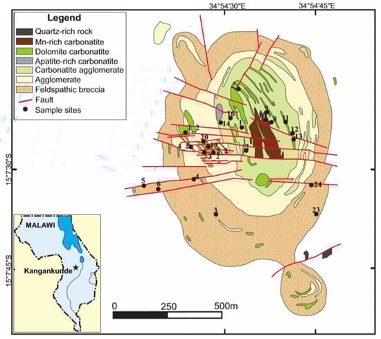 Figure 1. Geological map of the Kangankunde carbonatite complex showing sample locations (after Broom-Fendley et al. [5,15]). Inset shows the location of Kangankunde in Malawi, Africa.
