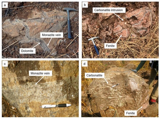 Throughout the complex, outcrops of carbonatite are commonly cut by veins that formed from late (carbothermal) intrusions (Figure 2a,b). Faults occur both regionally and locally in some of the carbonatites of the Chilwa Alkaline Complex. These faults are different from the local faults that developed at Kangankunde, which commonly strike NW and are absent in other carbonatite bodies in the Chilwa Alkaline Province. Well-developed monazite veins of a few cm in width are ubiquitous in the Kangankunde complex and cut carbonatite and fenite breccias (Figure 2c). Carbonatite agglomerates with distinct bulbous textures that resulted from weathering of the carbonate were observed in some lithologies (Figure 2d).