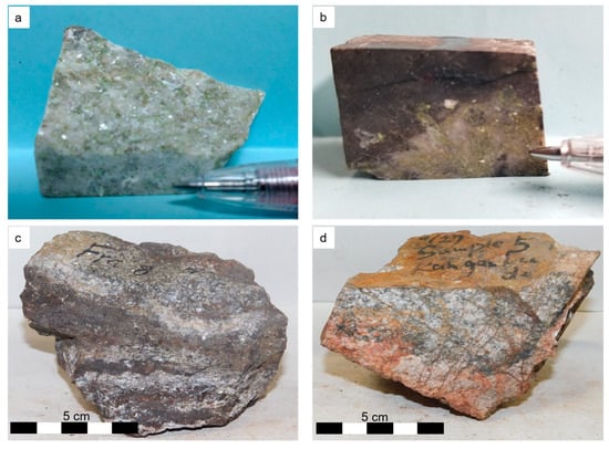 Monazite, which is the main host for the REE, imparts a green color to the carbonatites, allowing mineralized rock to be distinguished from barren rock. Samples were collected and classified into light (Figure 3a) and dark (Figure 3b) carbonatites based on their physical appearance [5], apatite-rich carbonatites (Figure 3c), and fenites (Figure 3d). Representative samples were crushed to <75 µm powder for further analysis.