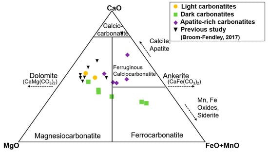 Figure 4. Classification of the Kangankunde carbonatites using molar proportions of CaO, MgO, and FeO + MnO (after Grittins and Harmer [36]). Arrows indicate the trends that occur with increasing contents of the specified minerals. Chemical compositoins of the Kangankunde carbonatites from a previous study [5] are plotted for comparison.