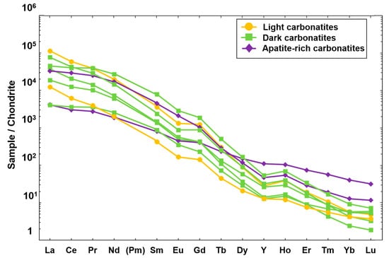 Figure 5. Chondrite-normalized REE patterns of the different types of carbonatites in the Kangankunde Carbonatite Complex. Normalization values from McDonough and Sun [37].