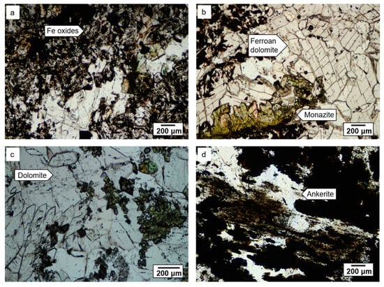The Kangankunde Carbonatite Complex consists primarily of ferroan dolomitic and ankeritic carbonatites, the former are subdivided based on color into light and dark varieties. The carbonatites, which comprise ~70% ferroan dolomite and ankerite, range from pristine to highly altered iron oxides (Figure 6). In the dark carbonatites, the carbonate matrix is mainly ankerite or ferroan dolomite, whereas dolomite is the major carbonate mineral in the light carbonatites. Two types of dark carbonatite are present in the complex. Although both types have been strongly altered into iron oxides, they differ in that one type does not contain monazite or REE mineralization (Figure 6a), whereas the other type does (Figure 6b). Furthermore, the light carbonatites (Figure 6c) comprise mainly euhedral and unaltered dolomite and are comparatively less abundant throughout the complex. In contrast to the carbonate in the light and dark carbonatites, that in apatite-rich carbonatites has been replaced by Fe–Ti oxides in a fluidal pattern (Figure 6d). Iron oxides are present with varying contents of Fe, with the highly altered carbonatites having higher proportions of iron oxides. The iron oxides comprise hematite, goethite, and an unidentified Fe–Mn–Ba-bearing oxide. Calcite is absent in most of the Kangankunde carbonatites, with only minor amounts occurring in the apatite-rich carbonatites. A few other Kangankunde carbonatites that were observed have similar characteristics to the dark carbonatites but are not discussed further as they are categorized as an independent group given their higher proportions of quartz (~26.6%), likely the quartz-rich rocks as previously defined [15].