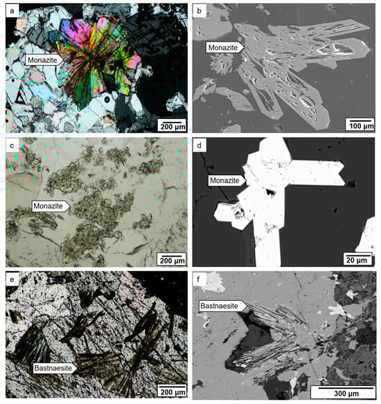 The main REE-bearing minerals in the Kangankunde Carbonatite Complex are monazite, bastnaesite, and synchysite. Monazite, which is the most abundant REE-bearing mineral, is green in hand specimen and exhibits a greenish brown color under plane-polarized light. Two varieties of monazite are present. One variant comprises large (~200 µm) well-developed crystals that typically occur along the boundaries of dolomite and is commonly observed with abundant iron oxides (Figure 7a). These crystals vary from porous in the core to non-porous in the rim (Figure 7b). The second variant comprises small polycrystalline aggregates of monazite that rarely occur with iron oxides (Figure 7c,d). Bastnaesite and synchysite are less common than monazite and occur as thin needle-like laths (Figure 7e,f) in dolomite.
