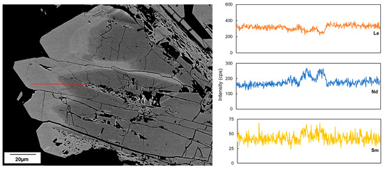Furthermore, the large monazite crystals display chemical zoning as shown in the backscattered image in Figure 8 and Table A2. The rims are slightly enriched in HREE (Nd and Sm) compared to the cores. The distribution of LREE is quite homogeneous within the crystal but in minor cases shows a depletion of La and Ce in the rims. Although the texture of the monazite cores can either be porous or non-porous, they are compositionally similar in either case.