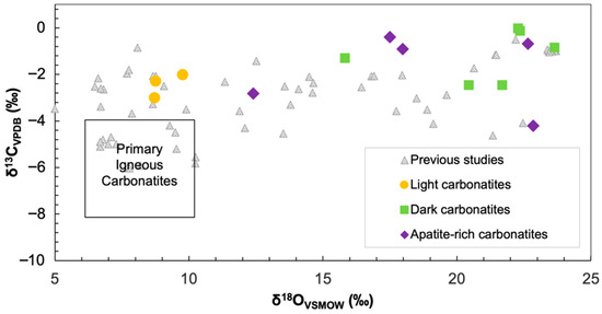 Figure 9. Whole-rock δ13C and δ18O compositions of the Kangankunde carbonatites compared with those in a previous study [5]. Compositional fields are shown for primary igneous carbonatites [29].