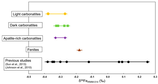 The δ56Fe values for the Kangankunde carbonatites range from −0.38‰ to −0.25‰, with fenite having a value of −0.18‰ (Table A4). These values are similar to the average δ56Fe value for magmatic carbonatites (−0.30‰ ± 0.05‰) [23]. No correlation exists between the δ56Fe values and Fe contents of the samples.
