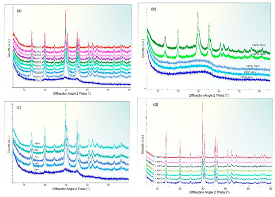 Four different series of aegirine synthesis and heat treatment experiments were performed, for which selected X-ray diffraction pattern are shown in Figure 3a–d. The first series (Figure 3a) shows the characteristics of the sample material depending on synthesis temperature at a fixed synthesis time of 24 h. The X-ray diffraction data evidence that the experiment at 130 °C yields amorphous material; at 150 °C large amounts of amorphous material are accompanied by first evidences of nano-crystallites of aegirine. At 155 °C, the powder diffraction pattern already shows the typical peaks of aegirine, although with large linewidth, indicative for the nano-crystalline state of the material. With increasing temperature, peaks become sharper and, e.g., the broad line at ~30° 2θ evolves to a well separated doublet. Additionally, a small shift of Bragg-peaks can be observed, which is indicative for some changes in unit cell parameters, as discussed below. Based on the spike method, described in Section 2.3., samples contain negligible amorphous material (within the precision of the method) at and above 155 °C.