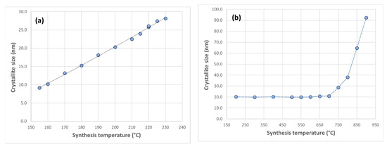 After this qualitative analysis, all the data were investigated in more depth using a full-pattern Rietveld analysis [38] with respect to unit-cell dimension refinement, and extraction of structural and microstructural parameters. The starting structural parameters of aegirine for Rietveld refinement were taken from [33]. Typical Rietveld analyses are shown in Appendix A, Figure A2, the most important results are compiled in Table 1. With increasing synthesis temperature at constant holding time, two main features are evident: the crystallite size, extracted from the volume based integral breath of the Bragg peaks of the whole pattern, is positively correlated with the synthesis temperature and increases almost linearly between 155 °C and 230 °C. Crystallite sizes of 9.2 (2) nm are determined for the temperature of 155 °C which increase up to 28.1 (3) nm at 230 °C (Figure 4a). It is interesting to note that the crystallite size obtained from PXRD matches well the smallest dimension of the crystallites, i.e., the diameter of the laths/needles in TEM. Recall that in XRD an average crystallite size is determined, but not the particle size of an aggregate, which can consist of multiple crystallites. As is seen in the TEM images, the individual crystallites are highly acicular, thus the crystallite size reported here is only an approximation as generally is the case for crystallite sizes as determined by XRD for anisotropic habitus of crystallites. The anisotropic nature of the crystallites can also be seen in the PXRD pattern itself by slight evidence for an anisotropic line broadening. The microstrain in all samples is low and remains almost constant within the temperature series, with a small tendency to decrease with increasing crystallite size/synthesis temperature.