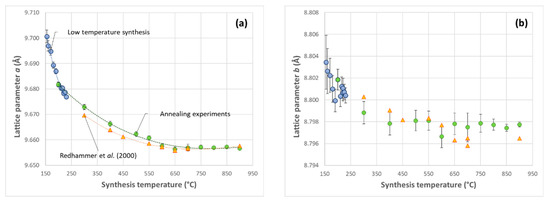 It was already noted in [4] that lattice parameters of end-member aegirine are inversely correlated with synthesis temperature but stabilize at some certain temperatures. In Figure 5, data of these different synthesis series are compared. Within the series of additional secondary heat treatment using the 200 °C/24 h sample, it also becomes evident that with increasing sintering temperature, the unit cell parameters change with very similar trends to the (newly recorded and evaluated) data on the hydrothermally synthesized samples of [4]. The two series follow a more general common trend, especially at temperatures above 600 °C, where they tend to stabilizes at some common values and become rather independent on synthesis or sintering temperature. At lower temperatures, the data for the sintering experiments on the low-temperature synthesis 200 °C sample are somewhat higher, which may be seen as an indication of a higher initial disorder. The clearest variation is shown by data of the a lattice parameter (Figure 5a) where the overall decrease between 155 °C and 900 °C is 0.45%, c decreases by 0.35% while the b-axis shrinks by only 0.06%.