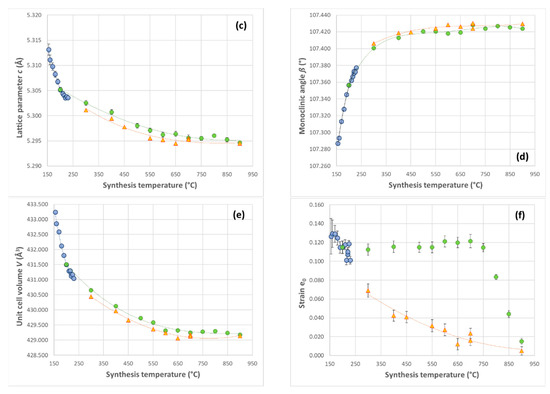 Variation of unit cell parameters (a–e) for the aegirines, synthesized at different temperatures between 155 °C and 230 °C (blue circles), for the aegirine obtained at 200 °C and sintered at different temperatures (green circles) and aegirines obtained from hydrothermal synthesis by [4] and reevaluated in this study (orange triangles), (f) gives the variation of dimensionless strain. Polynomial functions of 2nd to 3rd order were fitted to the data and serves as a guide to the eye only.