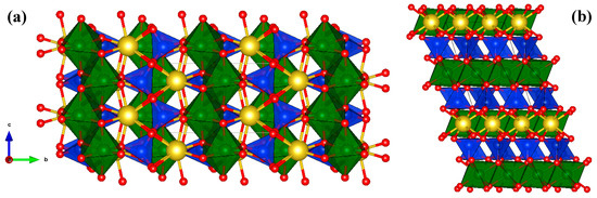 Polyhedral projection of the crystal structure of synthetic aegirine, as refined from the powder X-ray data of the sample, synthesized at 200 °C and sintered at 900 °C for 24 h: (a) viewed along the a-axis, (b) viewed along the b-axis. The data are available for display as Supplementary Material S2.