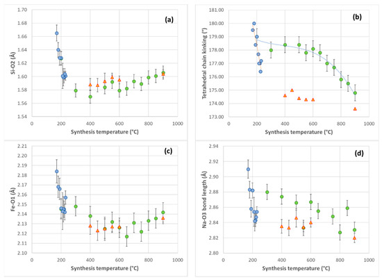 Within the SiO4 tetrahedron, small variations are observed for the Si–O1 and Si–O2 bond lengths, which link the tetrahedral to the octahedral chain along the a and b direction, respectively. For the Si–O2 bond lengths, there is a distinct decrease with increasing synthesis temperature in the 170 °C and 230 °C region (Figure 7a), the reversed trend—albeit not as prominent—is found for the Si–O1 bond lengths. Towards higher sintering temperatures, both distances increase slightly with temperature. For the Si–O3 bond lengths, which bridge the individual SiO4 tetrahedra in chain direction, no clear variations with temperature are observable, the average <Si–O> bond lengths slightly increase. The kinking state of the tetrahedral chain, which is defined by the O3–O3–O3 bond angle, changes with temperature. In samples, synthesized at very low temperatures, the chains are almost fully extended, with O3–O3–O3 angles close to 180°. With increasing synthesis temperature, the chains become kinked and approach values of ~174° (Figure 7b), which is the typical value, found in natural and perfectly crystallized synthetic aegirine [7]. Increasing the kinking, i.e. deviation from the extended chain, decreases the unit cell dimension along c, as is observed in Figure 5c, while along b, the “thickness” of the tetrahedral sheet increases; this balances the decrease of the Si–O2 bond lengths, thus only small changes are observed for the b-lattice parameter.