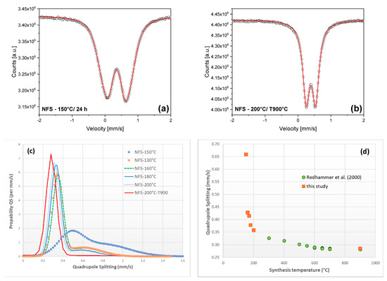 The trend of decreasing quadrupole splitting of Fe3+ with increasing synthesis temperature is shown in Figure 8d. Data of [4] are included and perfectly meet the trend, seen in the data of this study. Towards lower temperature, the negative correlation is further enhanced. This is not surprising, as towards lower temperatures, the crystallinity and the distortion of the structure decreases.