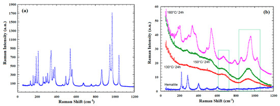 Figure 9b depicts the Raman spectra of samples, synthesized at low temperatures. In the 130 °C/24 h sample some broad bumps are observed which are centered around 925 cm−1 and 685 cm−1. These are in the regions of Si–Onbr and Si–Obr stretching modes: their presence indicates that some SiO4 clusters/chain fragments may already exist, while PXRD showed no evidence for discrete diffraction peaks. These peaks in Raman spectra gain intensity and become more structured towards the 150 °C/24 h sample. Small broad peaks at 220 and 280 cm−1 probably correspond to hematite Fe2O3 as can be read off from Figure 9b. At a synthesis temperature of 160 °C, the Raman spectrum of aegirine already shows the main features, even if the linewidths are broad and peaks not well resolved, as is the case for the PXRD data. At 160 °C, fully developed Raman spectra can be observed.