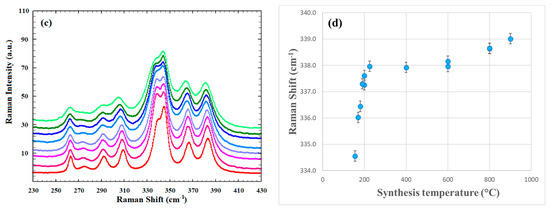 In detailed inspection of the spectra, it was found that most of the modes shift towards higher wavenumbers with increasing synthesis/sintering temperature (Figure 9c). Generally, this shift with temperature is small, but highly non-linear, a typical example is shown for the band at 339 cm−1 in Figure 9d. Similar to structural parameters, the shift in band positions is large in the 170–225 °C region. The data obtained from the 200 °C sample, sintered at different temperatures show only small variations with increasing sintering temperature up to 600 °C, while for the ones, sintered at 800 °C and 900 °C data start to shift towards higher wavenumbers again (red-shift). Largest shifts of ~5 cm−1 are observed for the bands at 309 cm−1, 339 cm−1 (Figure 9d) and 366 cm−1, which involve tilting and bending vibrations of the tetrahedron and O–Fe–O bending vibrations. This correlates well the shortening of the Fe–O bond lengths, i.e., increasing bond strengths and consequently a shift towards larger wavenumbers. The bands at 529 cm−1 and 542 cm−1 remain rather constant, also involve O–Fe–O bending, which may be seen as a contradiction of the above statement. However, structural data suggest that the short Fe–O bond lengths remain almost constant at ~1.95 Å, independent of synthesis and sample treatment temperature, so these Raman vibrations may involve O2–Fe–O2.