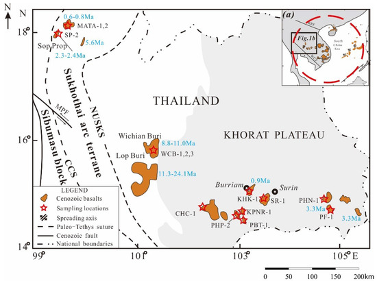 (a) Distribution of late Cenozoic intraplate volcanism in the SCS region. The dashed circle (in red) represents the influential cover range of Hainan mantle plume [26]. (b) Sketch geological map of Thailand showing Cenozoic fault systems, Cenozoic volcanic centers with age [24,26,27,33], and sampling locations. RRF, Red River fault; WCF, Wang Chao fault; MPF, Mae Ping fault; CCS, Chiangmai-Changthaburi suture; NUSKS, Nan-Uttaradit Sra Kaeo suture.