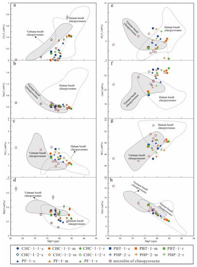 Chemical variations of clinopyroxenes phenocrysts. Data for northern Hainan basalts are from Wang et al. [18], and data for Vietnam are from Hoang et al. [43]. c-core; m-mantle; r-rim. The analyses of core–mantle–rim in a single phenocryst is linked by broken line. (a) Cr2O3 vs. Mg#; (b) Na2O vs. Mg#; (c) TiO2 vs. Mg#; (d) MnO vs. Mg#; (e) Al2O3 vs. Mg#; (f) CaO vs. Mg#; (g) SiO2 vs. Mg#; (h) FeO vs. Mg#.