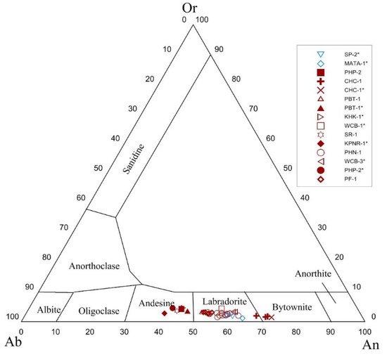 Classification of plagioclase in terms of its composition. * refers to plagioclases microlites.