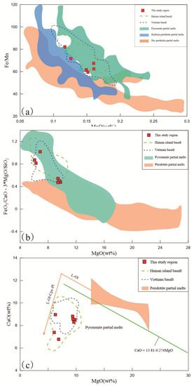 (a) MnO vs. Fe/Mn, (b) MgO vs. FeOT/CaO - 3 × MgO/SiO2, (c) MgO vs. CaO values for Thailand late Cenozoic basaltic rocks (MgO content > 6 wt. %). The fields showing experimental melts in (a) are modified from Liu et al. [46]. Data for Northern Hainan basalts are from Wang et al. [18], and data for Vietnam are from Hoang et al. [43]. The fields showing experimental melts in (b) are modified from Liu et al. [46]. Data for Vietnam are from Hoang et al. [43]. The thick green line in (c) separates peridotite- and pyroxenite-sourced primary melts [48]. The dashed orange arrow in (c) indicates the typical liquid line of descent (LLD) for primary magmas that crystallize gabbro in the crust [48]. Data for this study region are from Yan et al. [26].